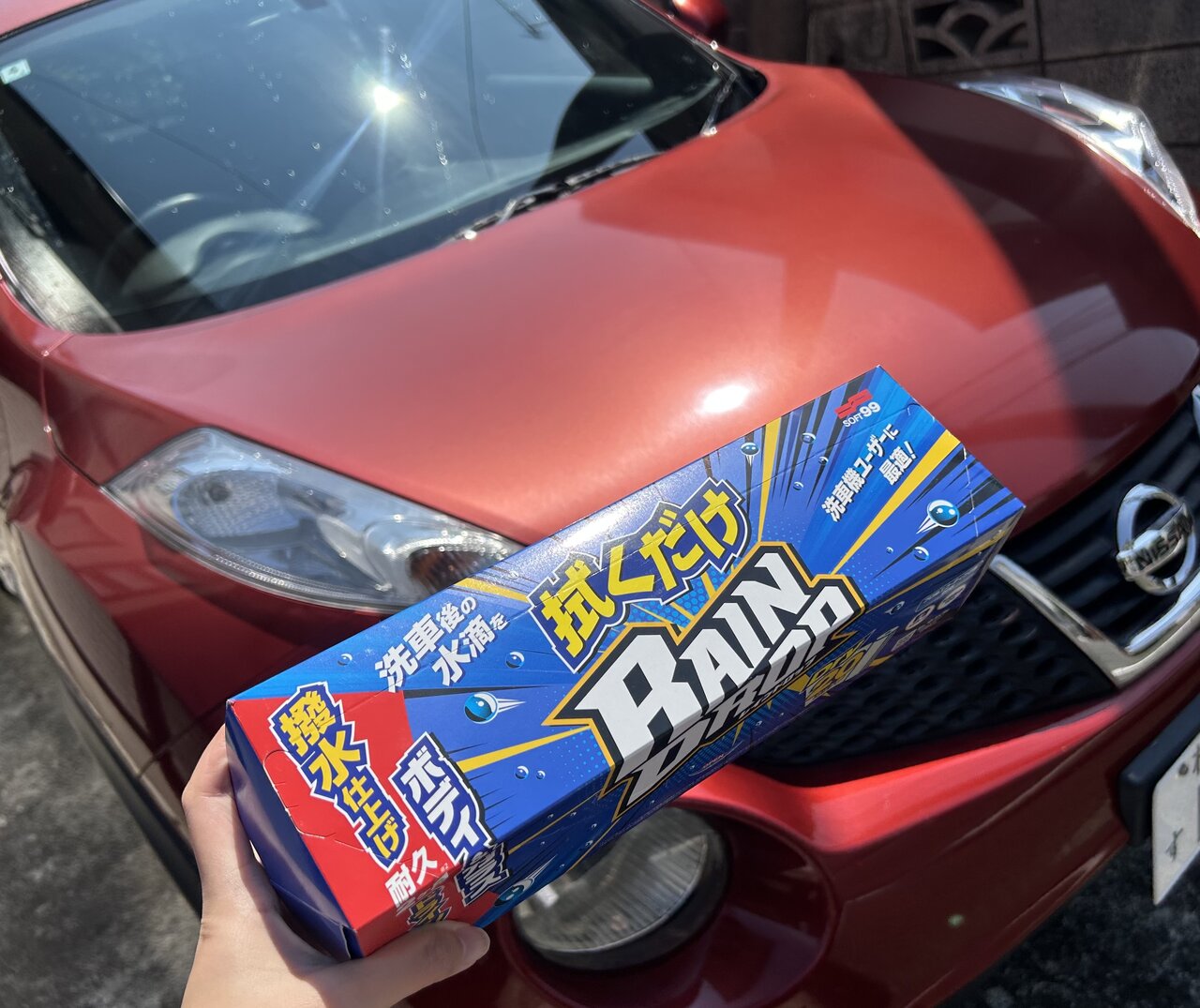そこでゲットしてきたのが、ソフト99の「拭くだけレインドロップ」。拭き上げと同時に撥水コーティングもできるカーケアグッズで、パッケージには「洗車機ユーザーに最適!」と書かれています。まさに今求めているアイテムを発見してしまいました。