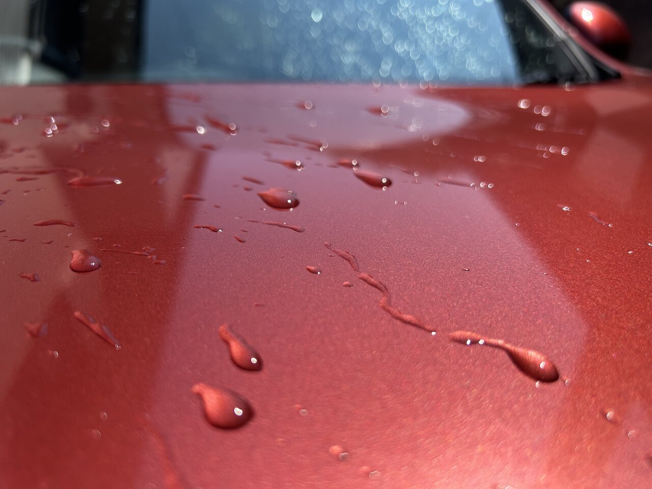 車体の中でも面積が広いボディもこの通り! 水玉ができていますね。これなら追加で撥水処理する必要はないでしょう。公式サイトによると、ボディは約2カ月、ガラスは約1カ月も撥水効果が続くんだとか。次の洗車時まで、撥水効果が持続してくれるというのは助かります。