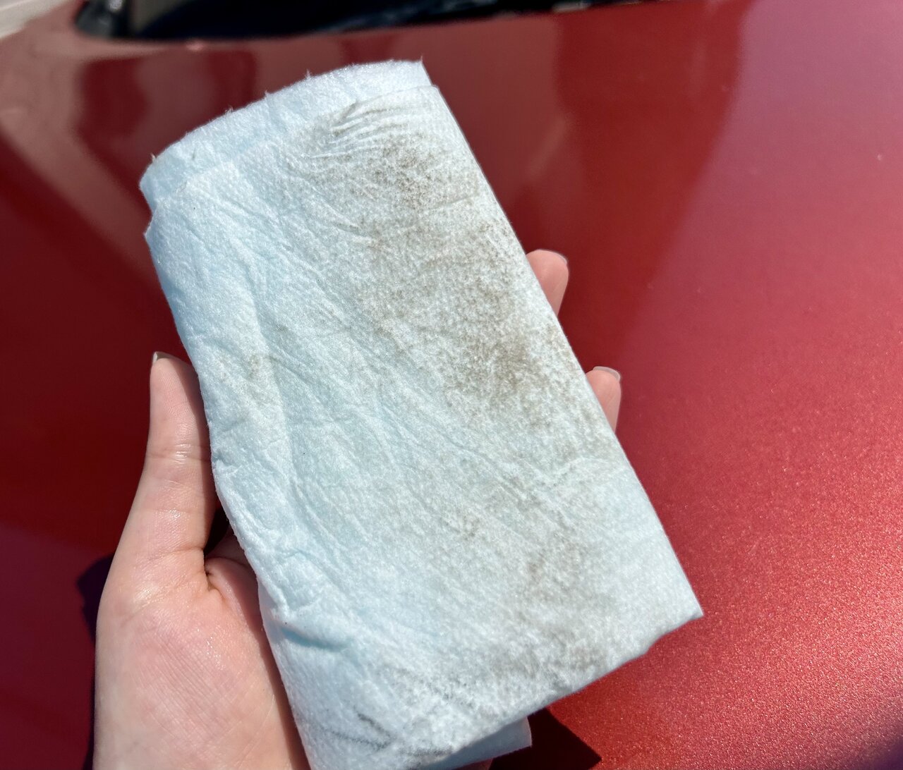 ボンネットを拭き上げた後のシートがこちら。想像以上に汚れもキャッチしています。洗車機だと細かな部分の汚れは落ちないと分かってはいたのですが、ボンネットにもまだまだ汚れが残っていたのですね。拭き上げ後のボンネットはピカピカです。
