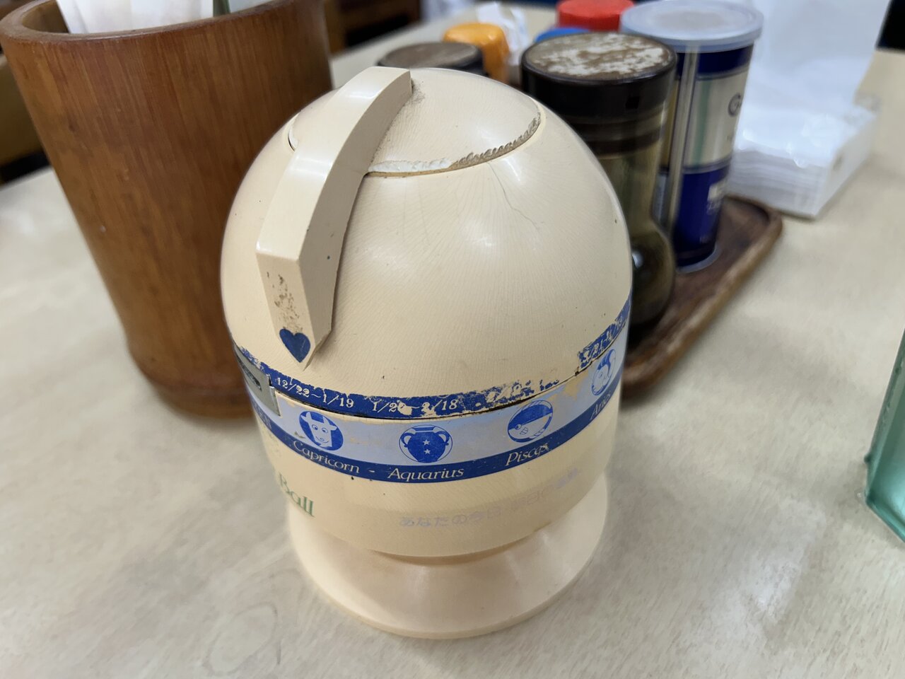 注文が完了して一息つくと、テーブルに懐かしい卓上おみくじ器を発見。子供の頃、祖母にお願いしてやらせてもらった記憶が蘇ってきました。