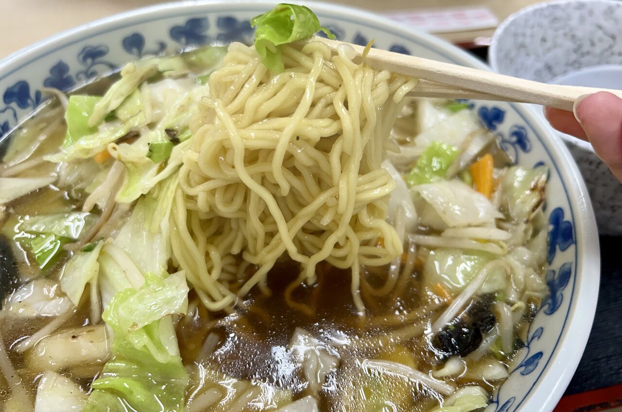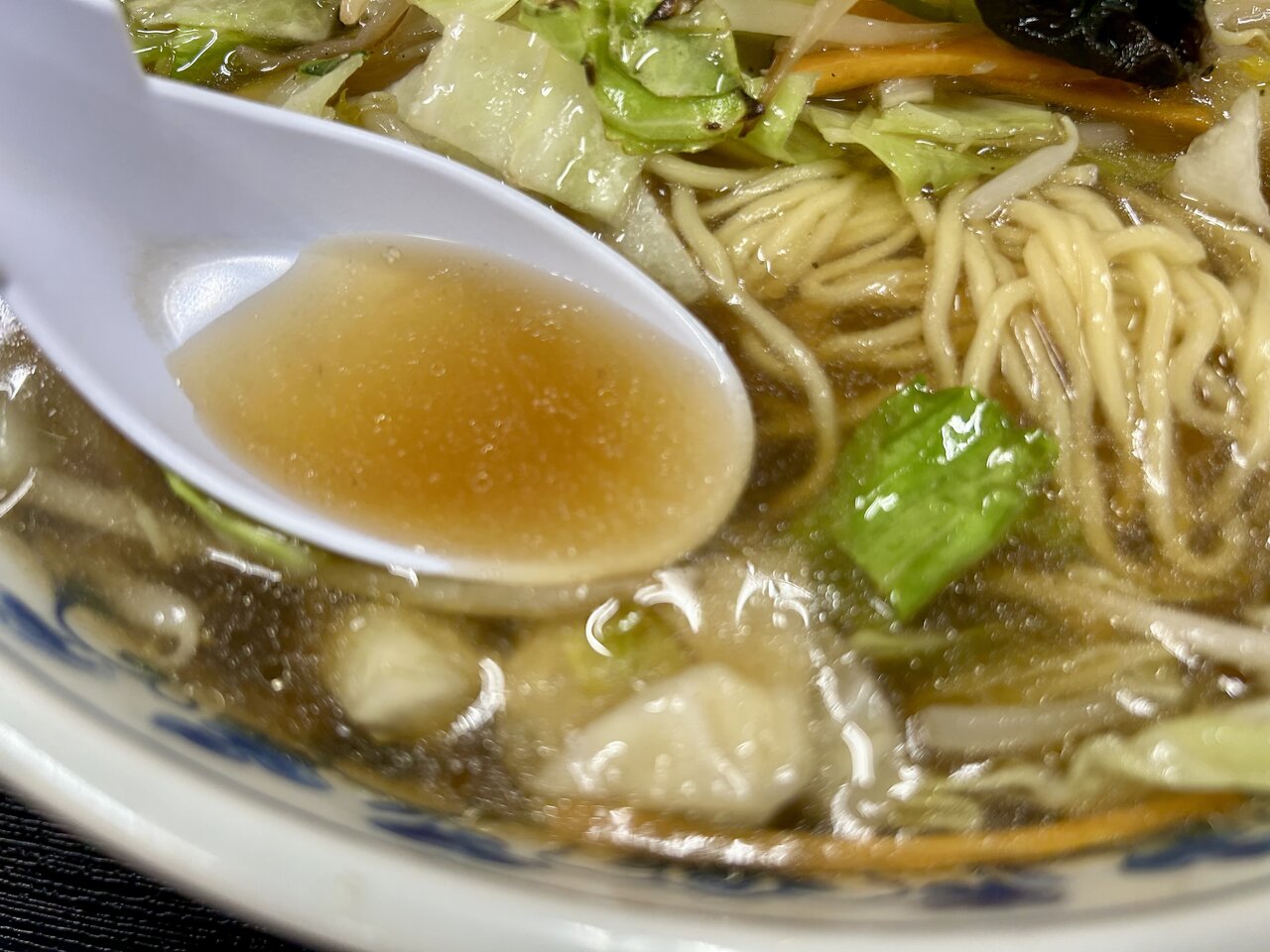 1口いただいてみると、うまい! 想像を超えるレベル高い味になっています。トッピングされているキャベツなどの野菜は程よく焦げ目がついていて、シャキシャキ食感と香ばしい風味が最高。少量入っているきくらげも、食感の良いアクセントになっています。醤油ベースのスープはあっさりしていて、心に沁みる味わい。
