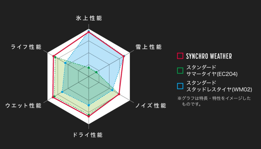 つまり、シンクロウェザーなら一年中タイヤを交換することなく、行きたい場所に行けるのです。