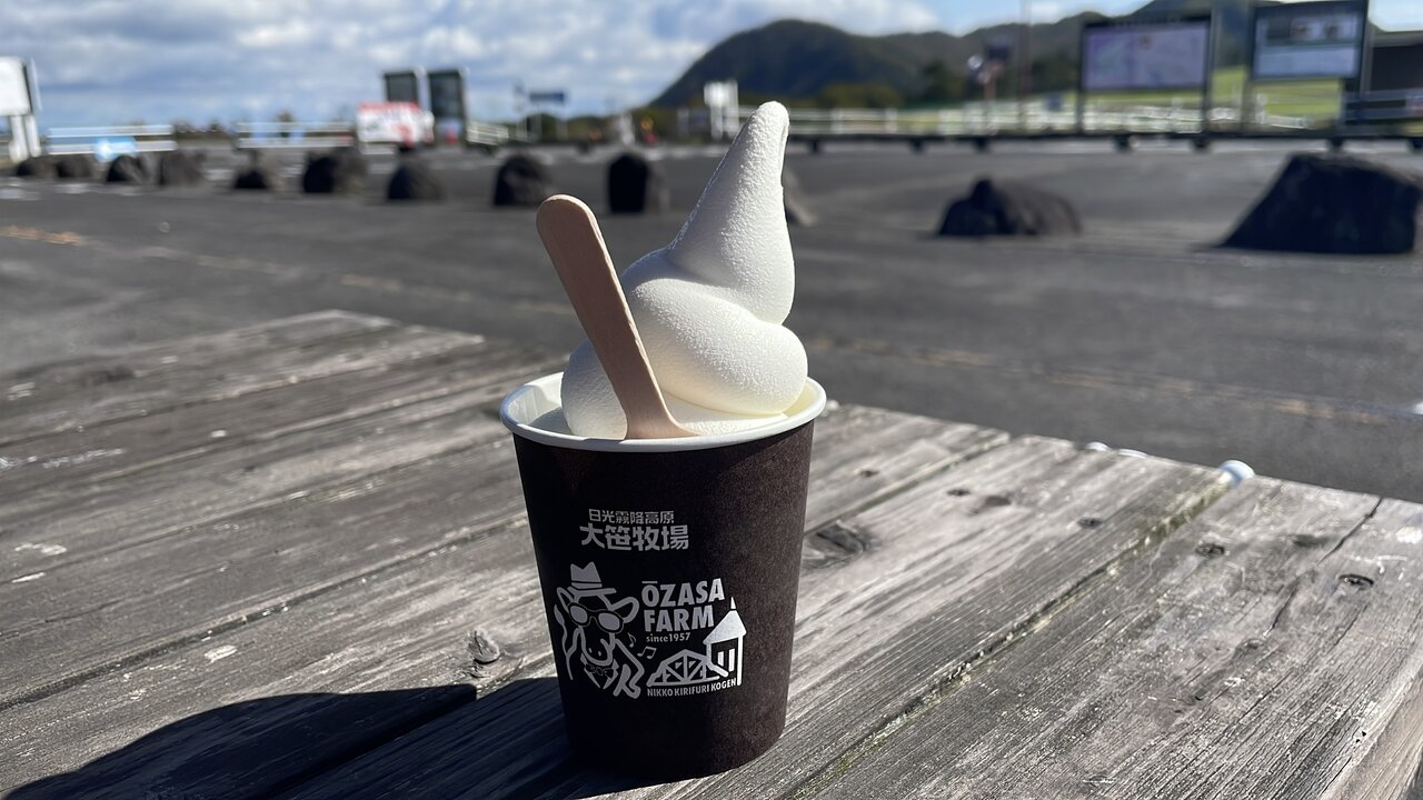 大笹牧場レストハウスに到着。こちらも混雑していないため、のびのび過ごすことができそう。ソフトクリームが売っているので、注文しました。