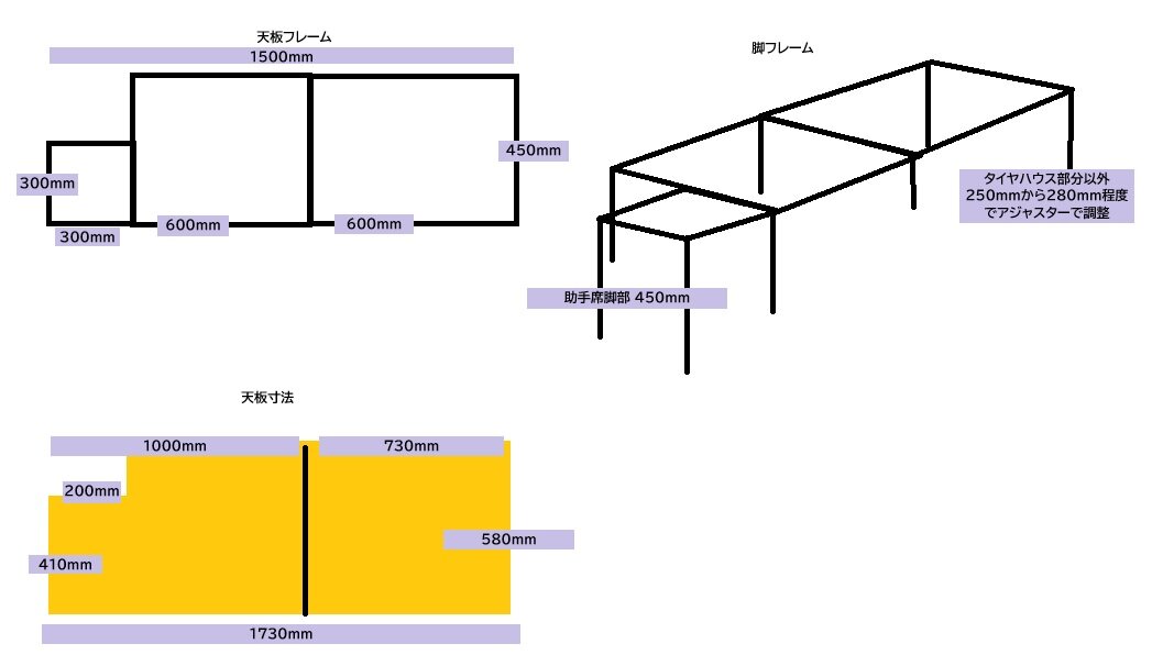 助手席部分の脚はカットしなくても問題なさそうですが、シフトレバー側がやや高くなります。天板フレームに関してはカット無しで上記の形にできるので、フレーム作成作業としては助手席脚部を除いた6本の脚をカットするだけでこの形にすることが可能です。