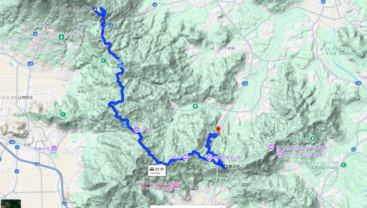 ルートは上図のような感じです。頭文字Dのコースは朝日峠から赤いピンがあるストレート部分までの区間となっていますが、個人的に筑波山ロープウェイ駅にあるレストハウスに行きたかったので、本記事ではロープウェイ駅からがスタートになります。
