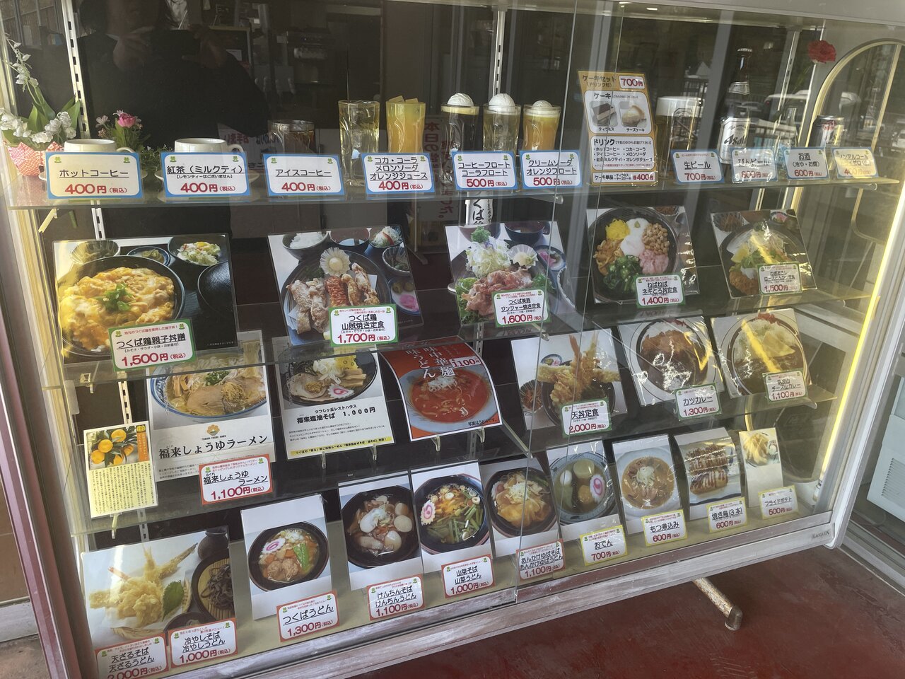 メニューも豊富で、ドライブやツーリングのちょっとした休憩にも良さそう。クリームソーダやホットコーヒーといった喫茶店メニューがあるのも良いですね。ショーケースを見ながら注文内容を決めて、いざ店内へ。