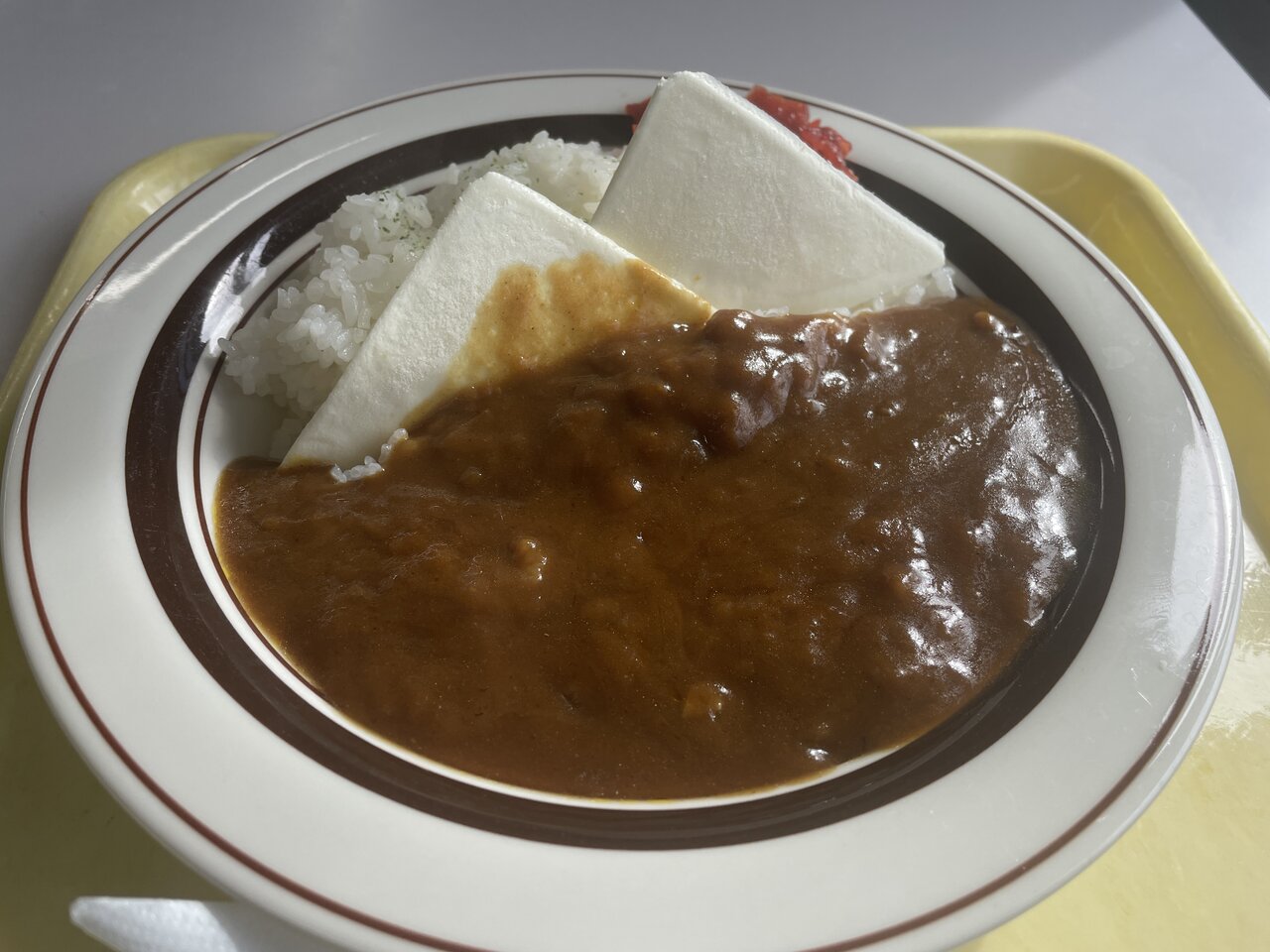 注文したのは「筑波山チーズ山カレー」です。山を模したスライスチーズが挟まっていて、どこか素朴な雰囲気のメニュー。こういうのが食べたかった。