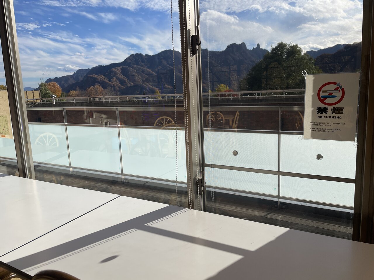館内はとても広く開放感があり、リラックスして食事できそうな雰囲気。店内を見回して、御岳、丁須岩、赤岩、烏帽子岩、谷急山からなる、裏妙義山系が一望できるカウンター席を選びました。