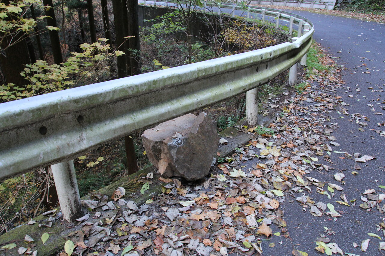 287号線から一転、ルートは細く脇にある深い側溝の存在が恐ろしい、走りにくい道となっています。大きな枝や落石が道路上に落ちていて、とても不穏な雰囲気。作中では土砂降りの雨の中のバトルとなっていますが、普通の感覚ではバトルなどあり得ない場所だと思いました。