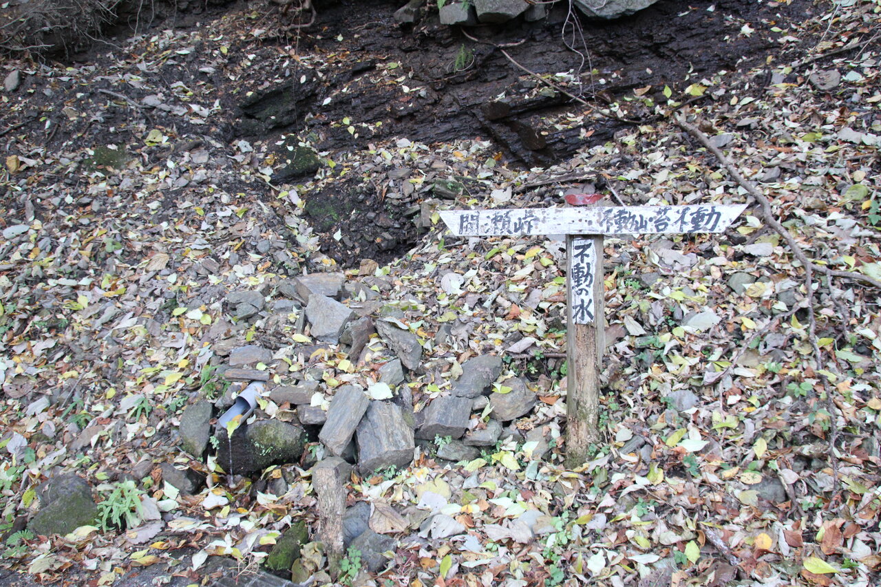 落ち葉で覆われた道路標示。近づいてみるとかろうじて確認できます。車両通行止めのようなマークで、どういう意味があるのかわかりませんが、峠の入り口の目印にもなる存在です。