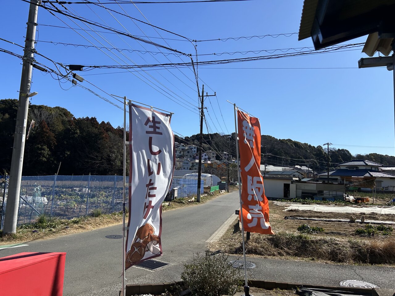 のどかな田舎道をクルマで走っていると、「生しいたけ」と「無人販売」というのぼりを発見! 初めて来た人にも目印になります。
