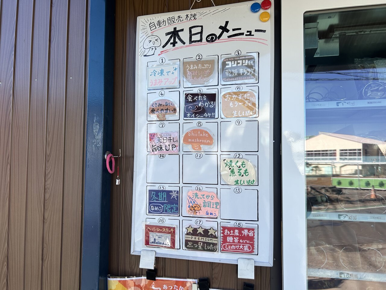 その内訳のような「本日のメニュー」表、自動販売機の隣に一言コメントのポップがあって親しみを感じます。こうして見てみると、しいたけのほかにもきくらげやなめこなどの種類の豊富さに、どれを買おうか迷ってしまいそう。