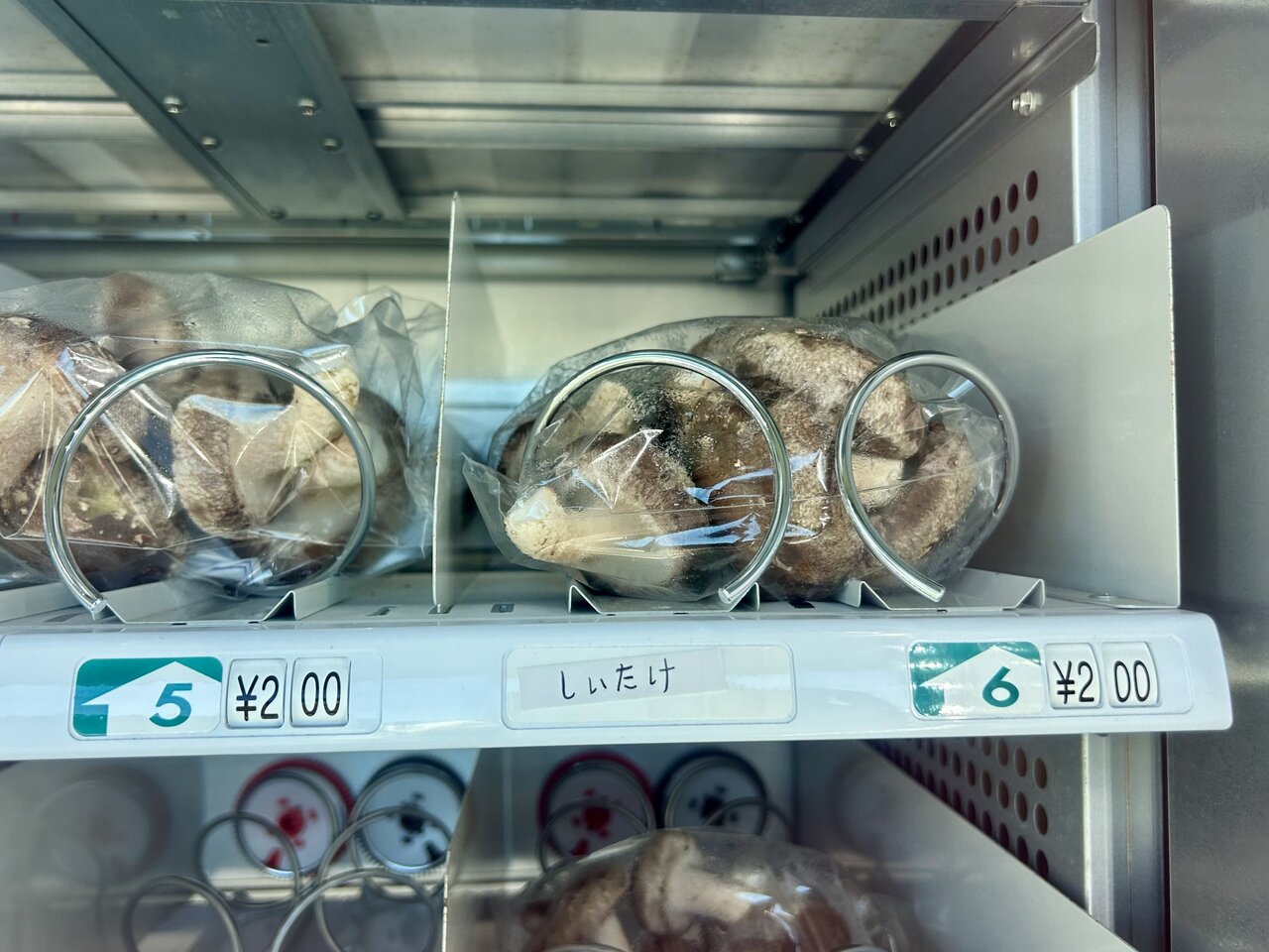 さっそく、自動販売機内をチェックしてみたところ……まだ在庫がありました! 中を覗くと、しいたけだけでなくいろいろと入っています。