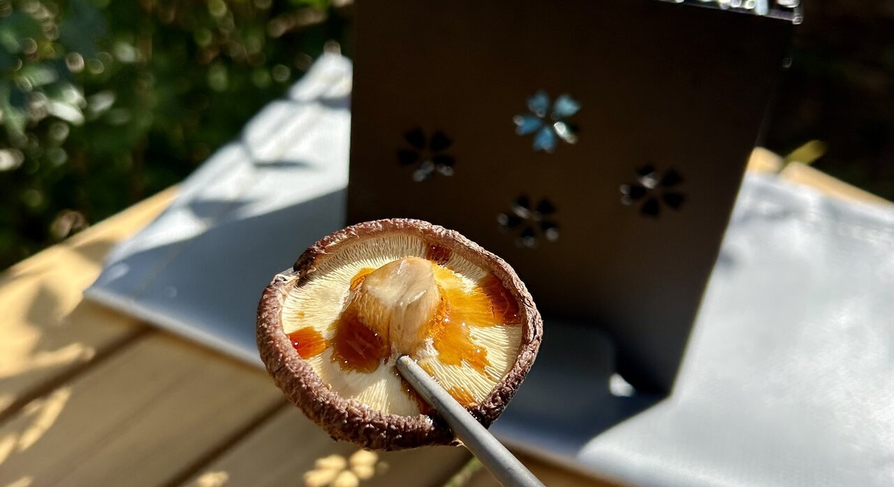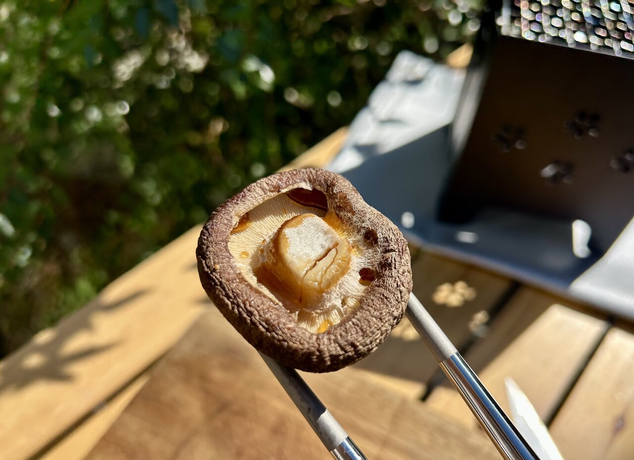 軸を切り落として、コンロでじっくり焼き上げていきます。コンロはダイソーの「マイクロストーブコンロ」に、固形燃料を入れて加熱しました。カサの内側に水分がたまってきたら頃合い、仕上げに醤油を少量たらして食べてみました。