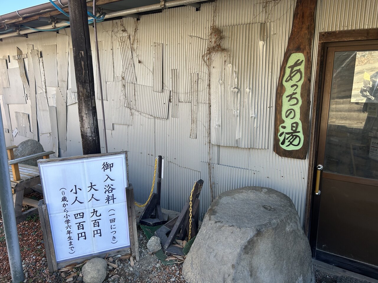 屋外特有の開放感や素朴な佇まいのせいでしょうか、なんだか山小屋のような雰囲気を感じられる温泉場。足を進めていくと、大きな看板が目に入ってきました。ほう、「ほったらかし温泉」には「あっちの湯」と「こっちの湯」があるんですね。