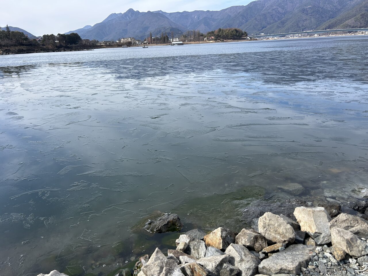 せっかくなので、河口湖も近くで見てみることに。この日は気温11℃、陽もさして過ごしやすい日だったものの、湖畔には氷が浮かんでいました。手をつけてみようとしゃがんでみると、近くにいた外国人観光客から「見て、鳥がいるよ」なんて話しかけられます。その人はインドから来ていて、日本各地を旅しているのだそう。こんな交流ができるのも、世界中から人が集まる今の河口湖ならではですね。
