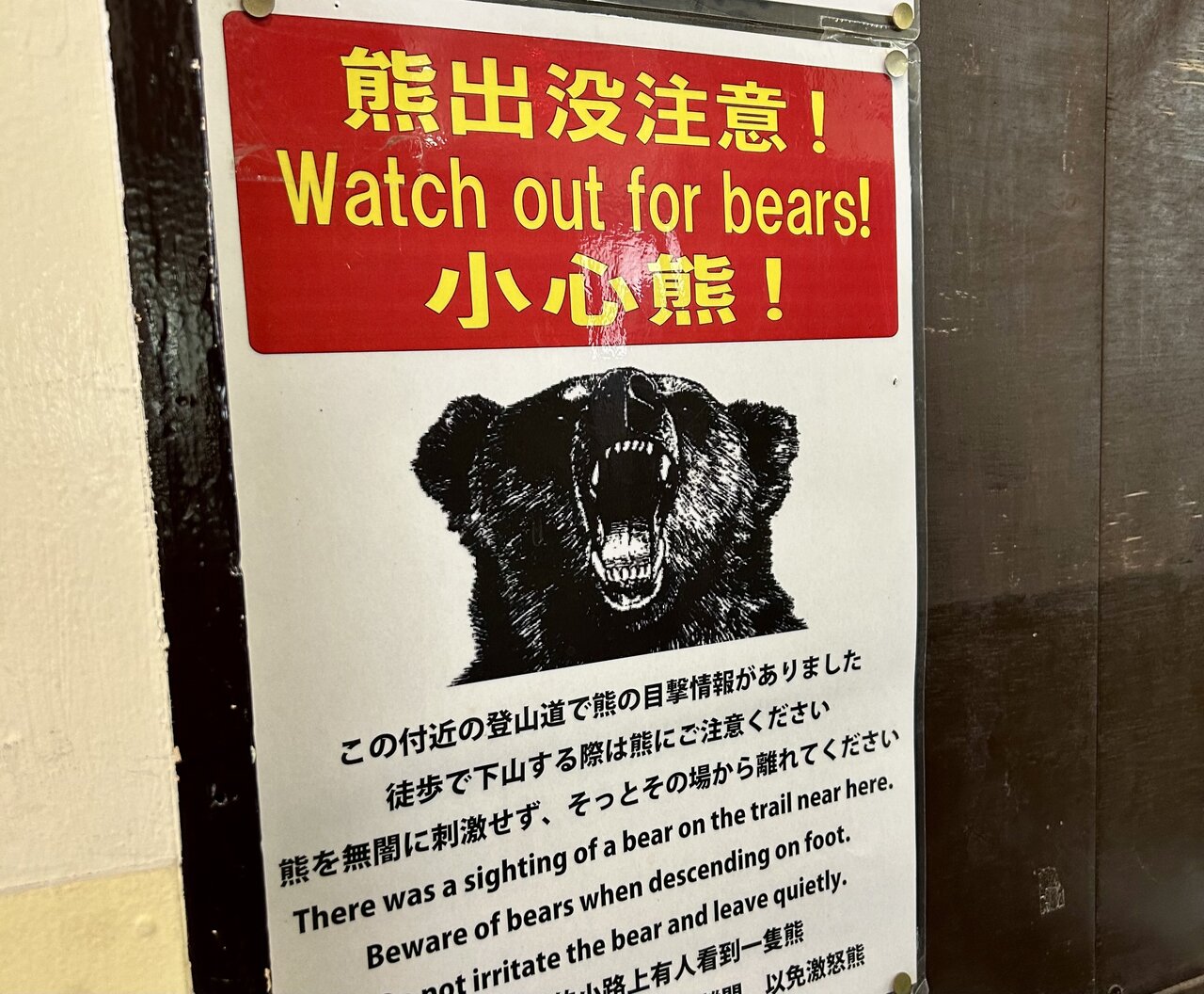 待機している時にふと目を向けてみると、こんな看板が目に飛び込んできました。この付近でも熊が出るのですね。目撃したら「無暗に刺激せず、そっとその場から離れてください」……。万が一熊と出くわしてしまっても、冷静に対処できる自信はありません。