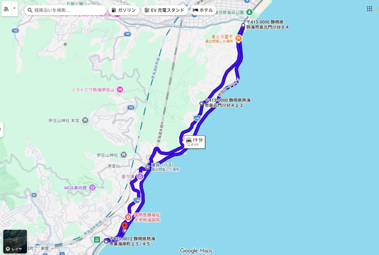 ガソリンスタンドのコーナーがゴール地点。この先は再び熱海ビーチラインの入り口になります。今回は早めにスタートした結果、連休の初日でありながら、スムーズにまわることができました。