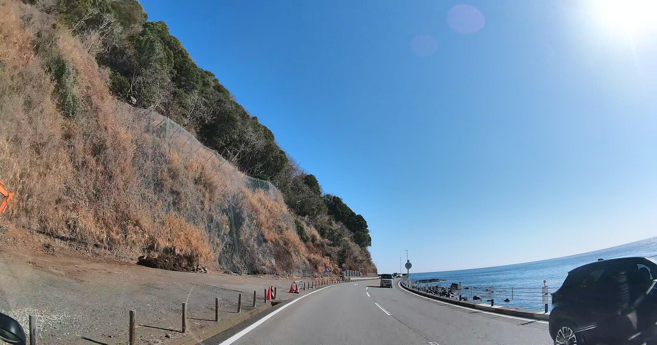 スタートしてすぐに見える印象的な赤い橋。ペニンシュラ真鶴でもこういった橋が架かっていて、海岸沿いの風景にマッチする赤いアーチが魅力的です。熱海ビーチラインは初めて走りましたが、とても美しく気持ちが良いルートです。