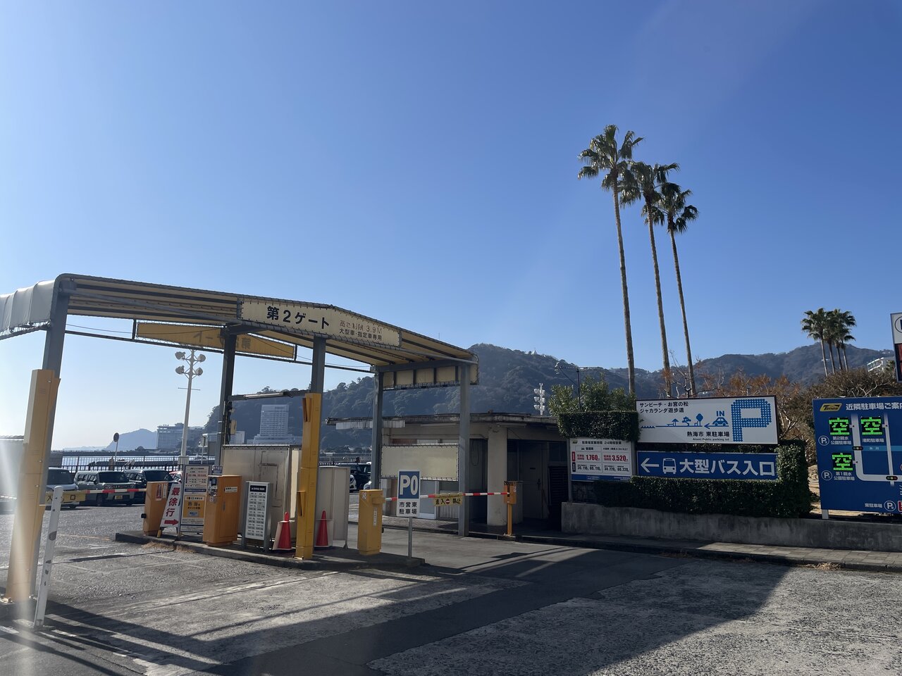 ゴール地点すぐそばにある「タイムズ熱海市営東」がパドックとなっていて、こちらも巡礼ポイントです。ヤシの木が生えていてリゾート感満点。時間に余裕ができたので、小田原で実施されているMFゴーストキャンペーンのグッズをゲットしに行きます。