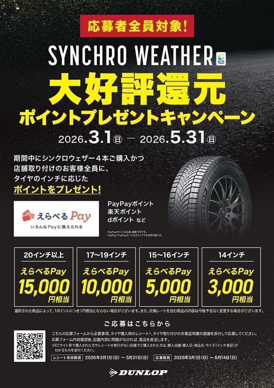 イベント開催期間を挟んで、ダンロップタイヤ「シンクロウェザー」では4本購入+店舗取り付けで、最大1万5000円相当のポイントもプレゼント中。PayPayポイント・楽天ポイント・dポイントなどに交換可能な「えらべるPay」が全員にもらえます。