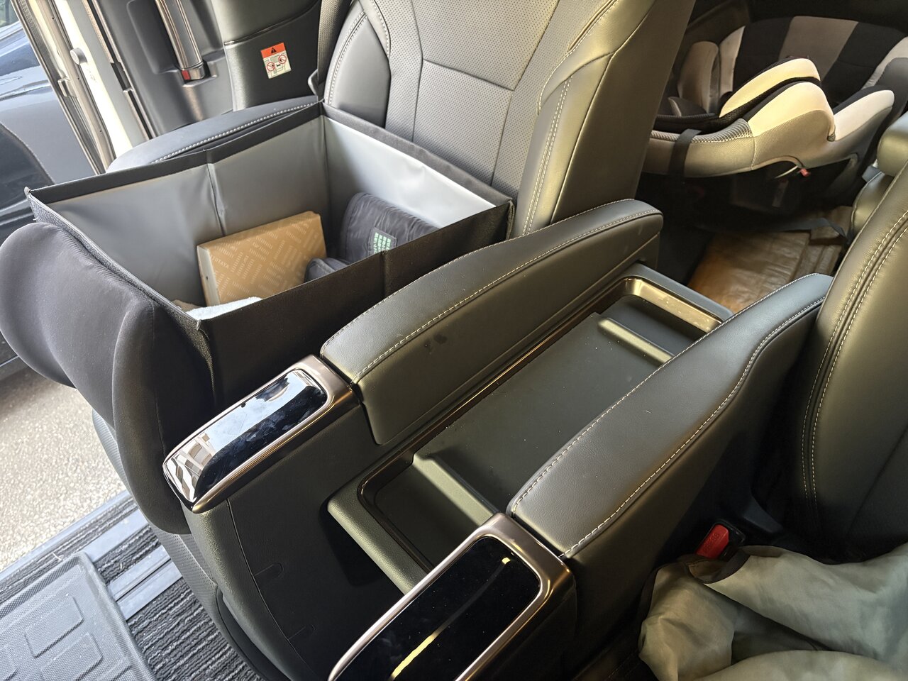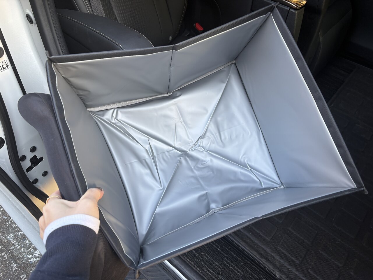 クッションの後ろの部分を広げると、ご覧の通り。ボックス型の箱になるという便利なもので、結構いろんなものが入りそう。これ一つで、ドライブ中のちょっとした過ごし方が変わるのかを試してみました。