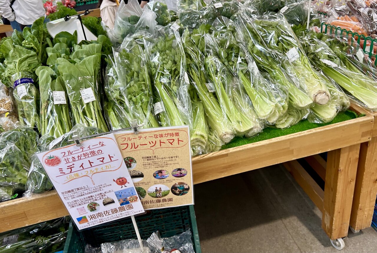 店内は穏やかな葉山公園とは打って変わり、活気に満ちた賑やかな空間が広がっていました。地元の農家から直送された新鮮な野菜もずらりと並び、近所のスーパーでは見かけない立派な三浦大根なども発見。