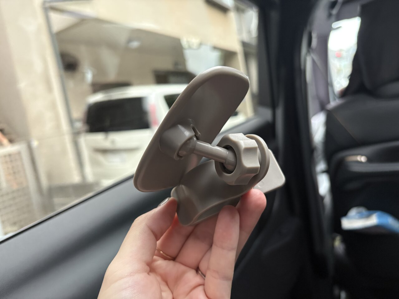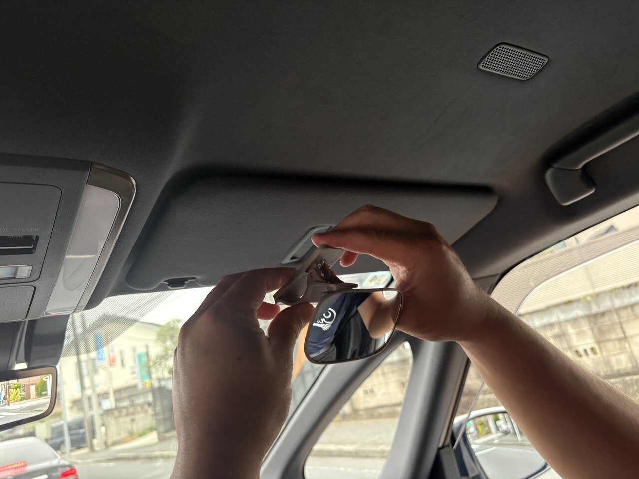 クリップ式でサンバイザーに固定するタイプなので、工具は不要。ミラーを取り付けて、後部座席が見える角度に調整する。それだけで設置完了しました。