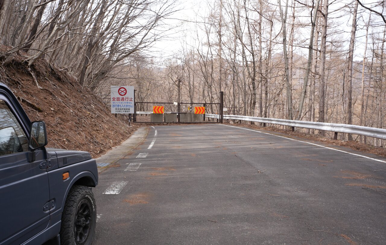終点となる通行止めゲートに到着。この付近はハイキングコースの入り口があるようですが、ゲートの先は歩行者ですら通行禁止のエリア。