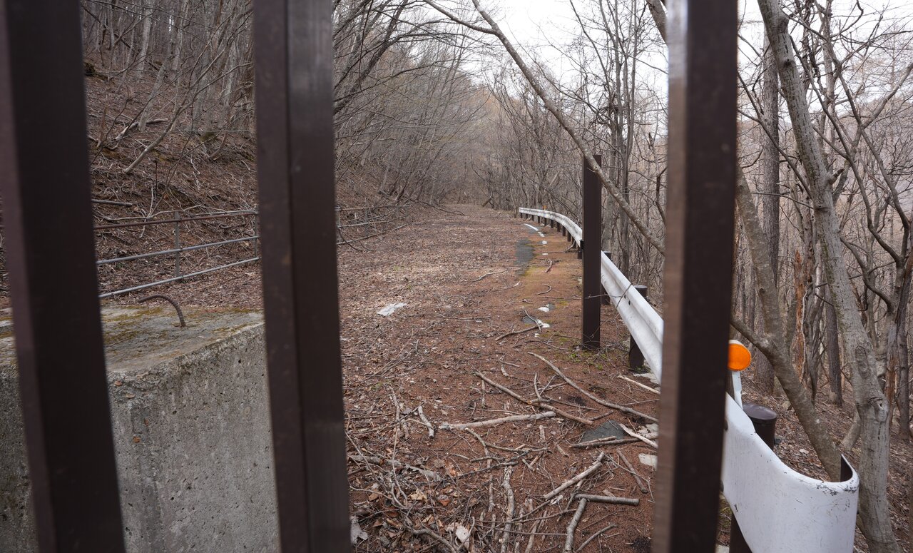 この先の塩那道路中間部分は植生回復工事が完了した状態となっているそう。ゲートの隙間から少しのぞいただけであらゆる建造物が風化し、自然の中に消えていく様子が想像できます。自然のみが広がる景色が美しいのは間違いないですが、人工物が入り混じった山中の景色は時の流れを感じさせ、なぜかノスタルジックな気分になります。