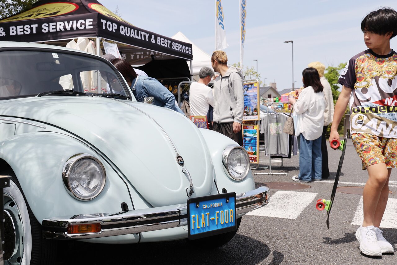 その中でも注目度が高かったのが横浜・本牧のクラシックフォルクスワーゲンのスペシャルショップ「FLAT4」(フラットフォー)のブース。テントにはオリジナルのアパレルや雑貨が販売されたほか、そのすぐ横に空冷ワーゲンの実車も展示。これはFLAT4創業50周年を記念した車両でした。