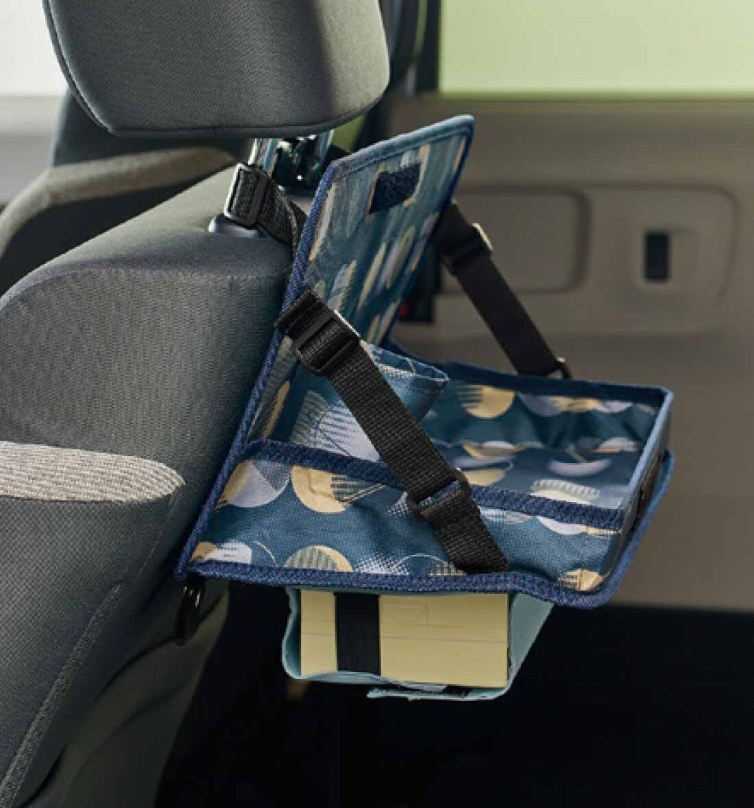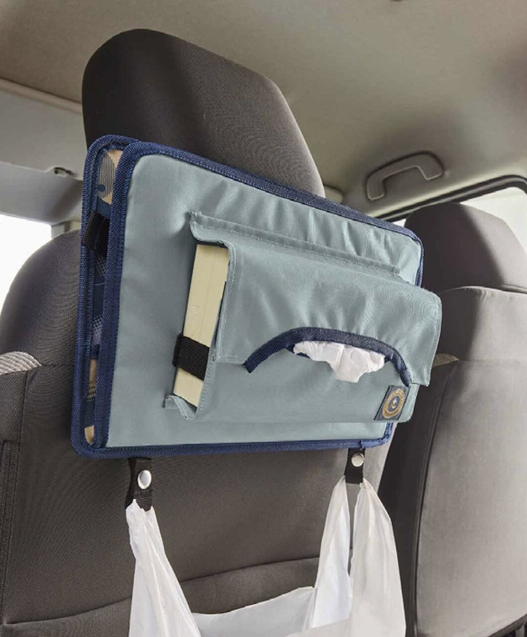 助手席のヘッドレストに取り付けるタイプで、500〜650mlのペットボトルが入る便利なポケット付き。フチがあるため落ちにくいのもポイントで、ラックの下にはゴミ袋を引っ掛けることができます。