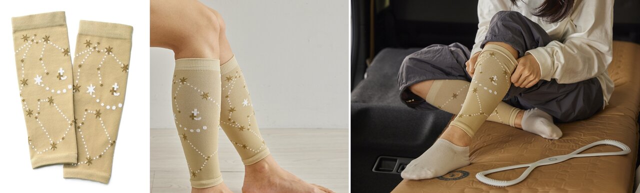 ストレッチチューブと着圧サポーターはどちらも幸運を意味する水瓶座と、健康のシンボルであるへびつかい座をデザイン。
