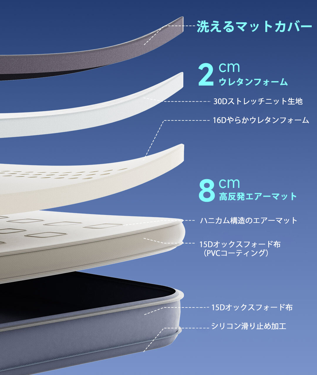 厚さ8cmの高反発エアーマットの上に2cmのウレタンフォームを重ねることで、クッション性を高めた3層構造のエアーマット「8H多機能マットレス」。ウレタンフォームは固さの違う2種類を組み合わせて、柔軟性を高めた構造となっています。洗えるマットカバー付属で清潔に保つことができるのもうれしいポイントです。