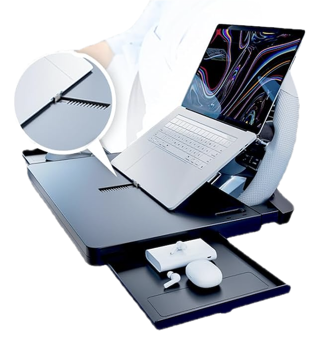 さらに、テーブルの中央にはパソコンスタンドも設けられ、パソコンの角度調整もできるという優れもの。ある程度の閉塞感って意外と集中力を高めるもの。もしかしたら自宅よりも作業が捗るかもしれません。