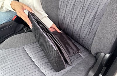 折りたためば、厚さ約6cmのクッションにアレンジ可能。座席や腰をサポートするランバークッションとして活用できるので、長時間ドライブの疲労を軽減してくれます。使わない時の収納場所に困りがちなアイテムだからこそ、一つで二役活用できるのは助かりますね。