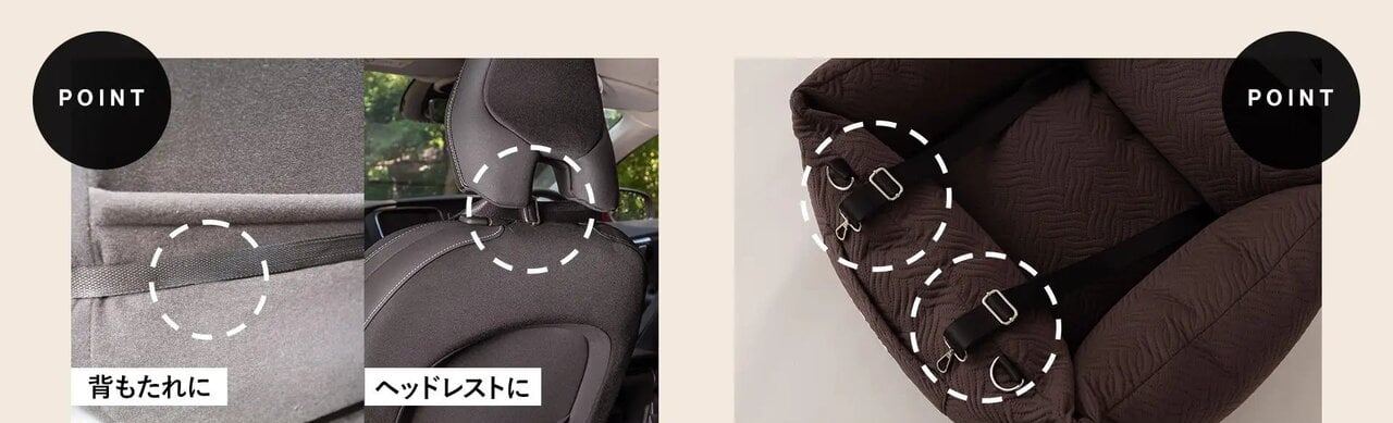 シートにしっかり固定できる上下2点の固定具付き。座席の背もたれとヘッドレストの2か所で支えるので、走行中もずれにくく安定感は抜群です。飛び出し防止リードは2本装備。2匹一緒にドライブベッドに乗せても、それぞれにリードでつなげるので安心して使用できます。