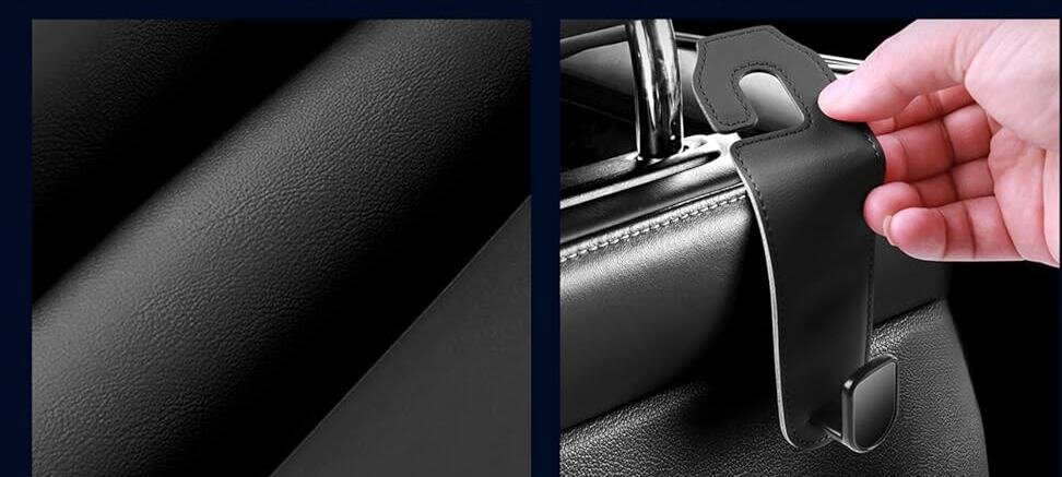 フックの上下2箇所には高強度アルミニウム素材を内蔵し、2Lペットボトル6本分まで耐えられる頑丈設計。高品質PUレザー製で、まるで純正品のように車内に馴染む上質感です。