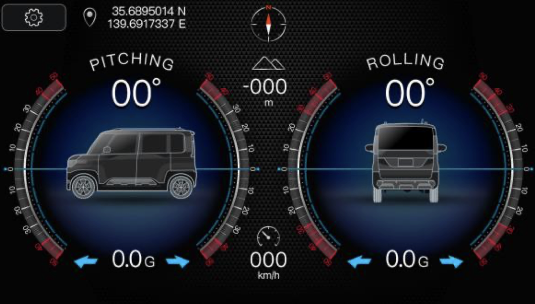 デリカミニ専用設計のため、起動時に専用のオープニングアニメーションや車種ロゴが表示されるなど、オーナーの所有感を高める演出も。さらに、専用クリノメーター(傾斜計)を内蔵していて、車体の傾きをリアルタイムで表示。山道やアウトドアでのドライブをより楽しくしてくれます。