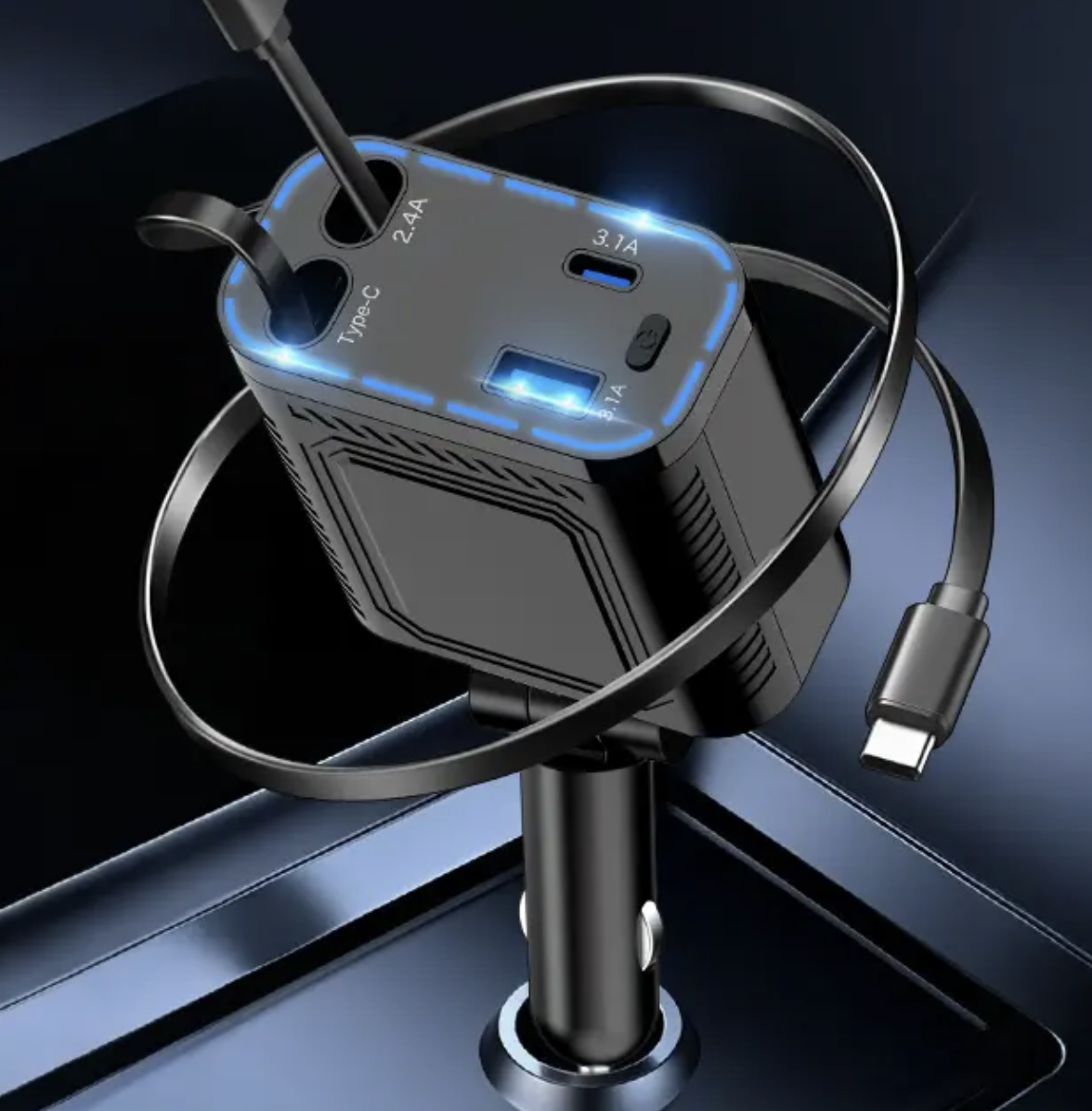 見た目はごく普通のカーチャージャーで、まさかスマートタグが入っているとは思えません。ポートにはType-A (12W)とType-C (12W)に加え、Type-C(30W)とLightning(12W)のケーブルを搭載。純粋な充電性能も高いって、もう完璧!