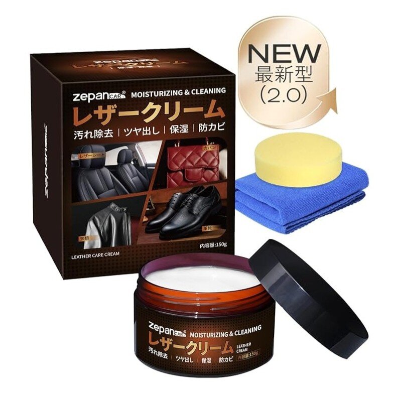 「レザークリーム(150g)」は、ボロボロになったシートをよみがえらせる乳化性タイプの艶出しクリーム。塗るだけでレザーの風合いを回復し、汚れ落とし・撥水・保護膜形成を同時に実現できます。香料不使用でベタつかず、車内・家具・衣類など幅広く使えるのも便利です。