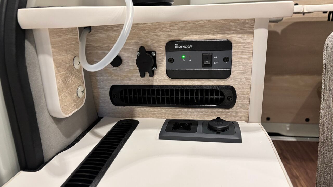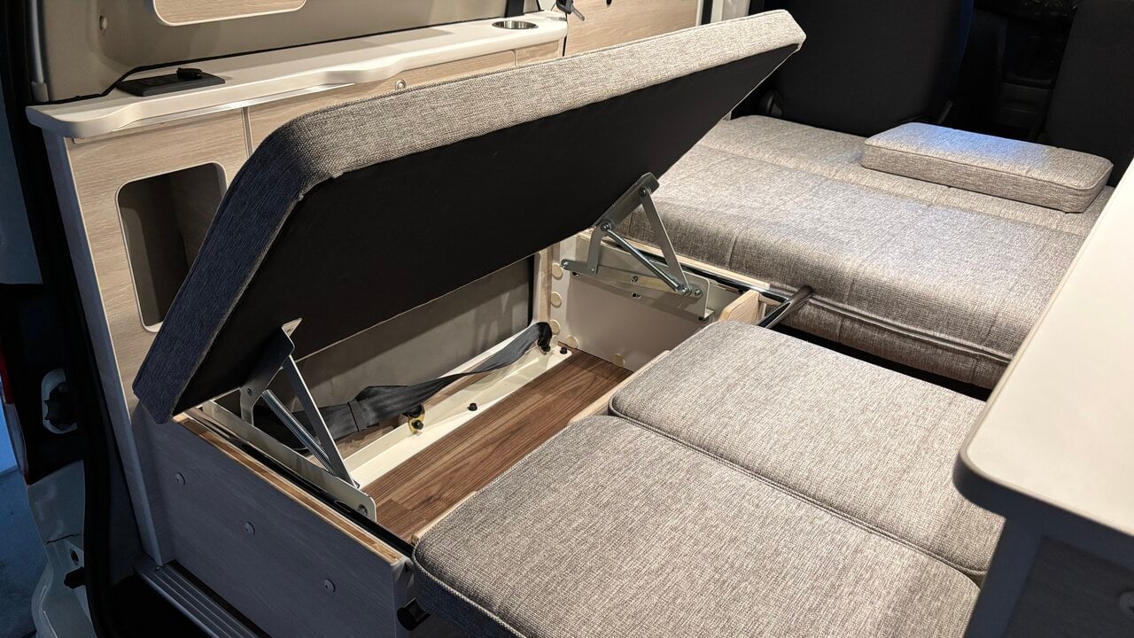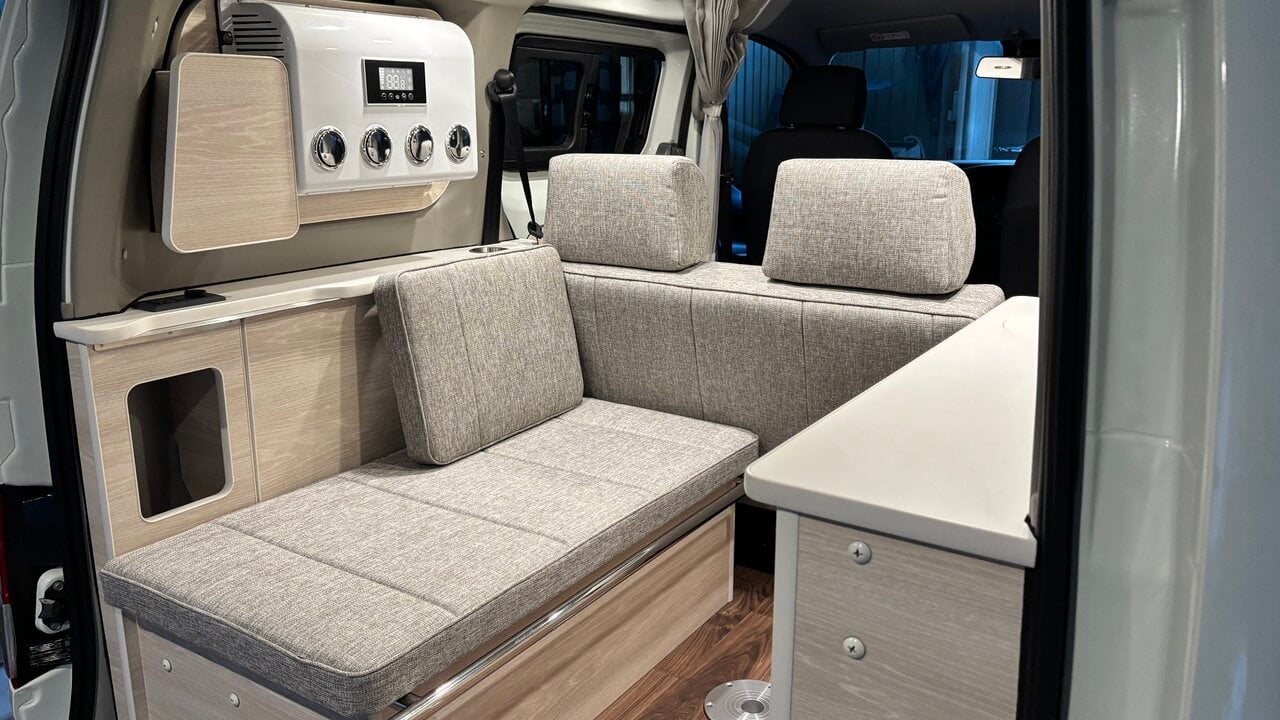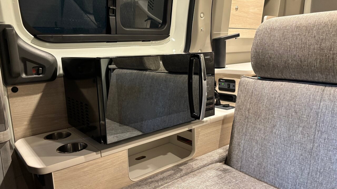 新型モデル「Canelé comfort(カヌレコンフォート)」では、ユーザーからの要望で多かったという電化製品のスペースの確保に注力したそう。ポータブル冷蔵庫や電子レンジを置くスペースを確保するために、セカンドシートの幅を従来の1200mmから1000mmに変更。これにより、右サイドのカウンターに専用スペースを生み出し、長旅でも新鮮な食事が楽しめるようになりました。