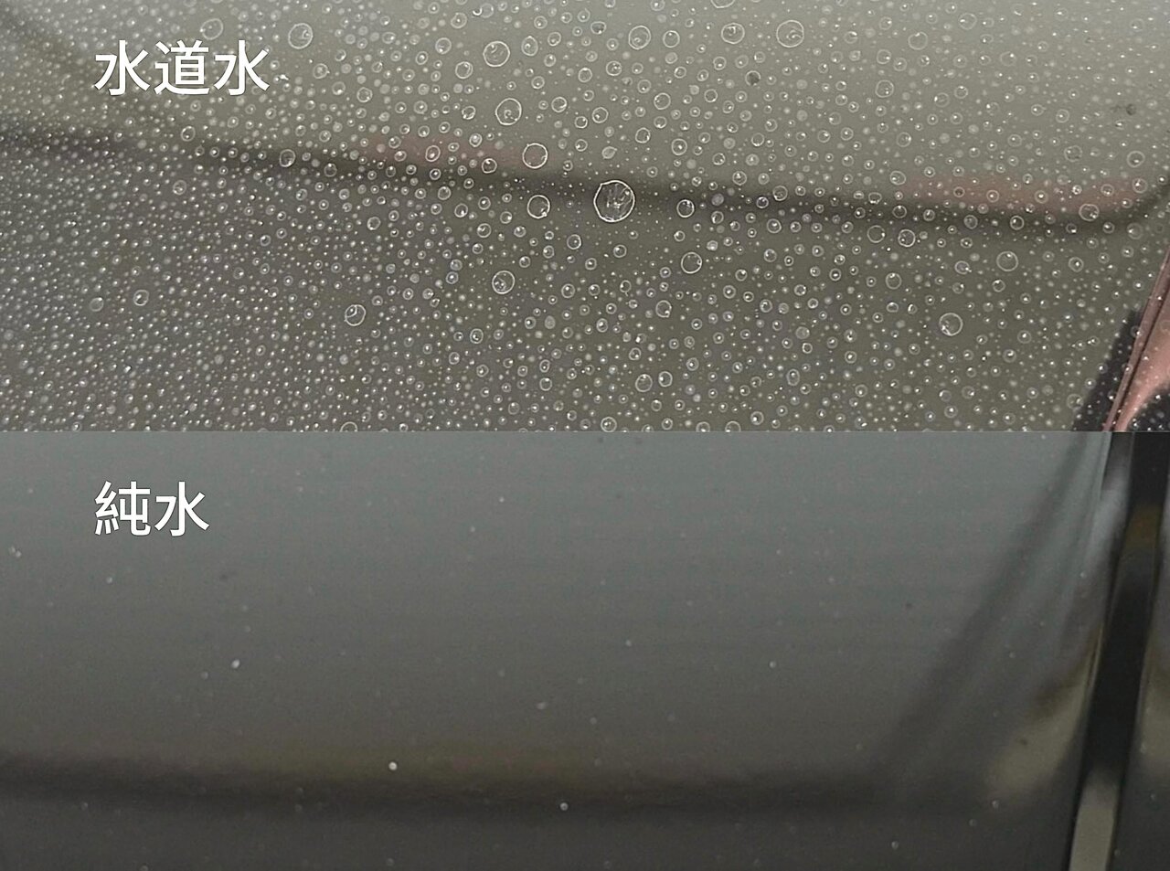 純水とは、ミネラル成分(カルシウム・マグネシウムなど)をほぼ完全に除いたの水のことで、水道水での洗車で起こる「ウォータースポット(白い斑点状の残り)」を防ぐ効果が期待できます。さらに拭き取り作業が不要になるため、微細な擦りキズの抑制にもつながります。