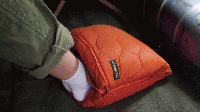 こんなふうに小さくたためばフットウォーマーとしても使うことができ、足先の冷たさも解消。足湯気分で、真冬でも車中泊が楽しめそうです。