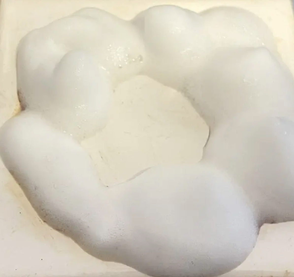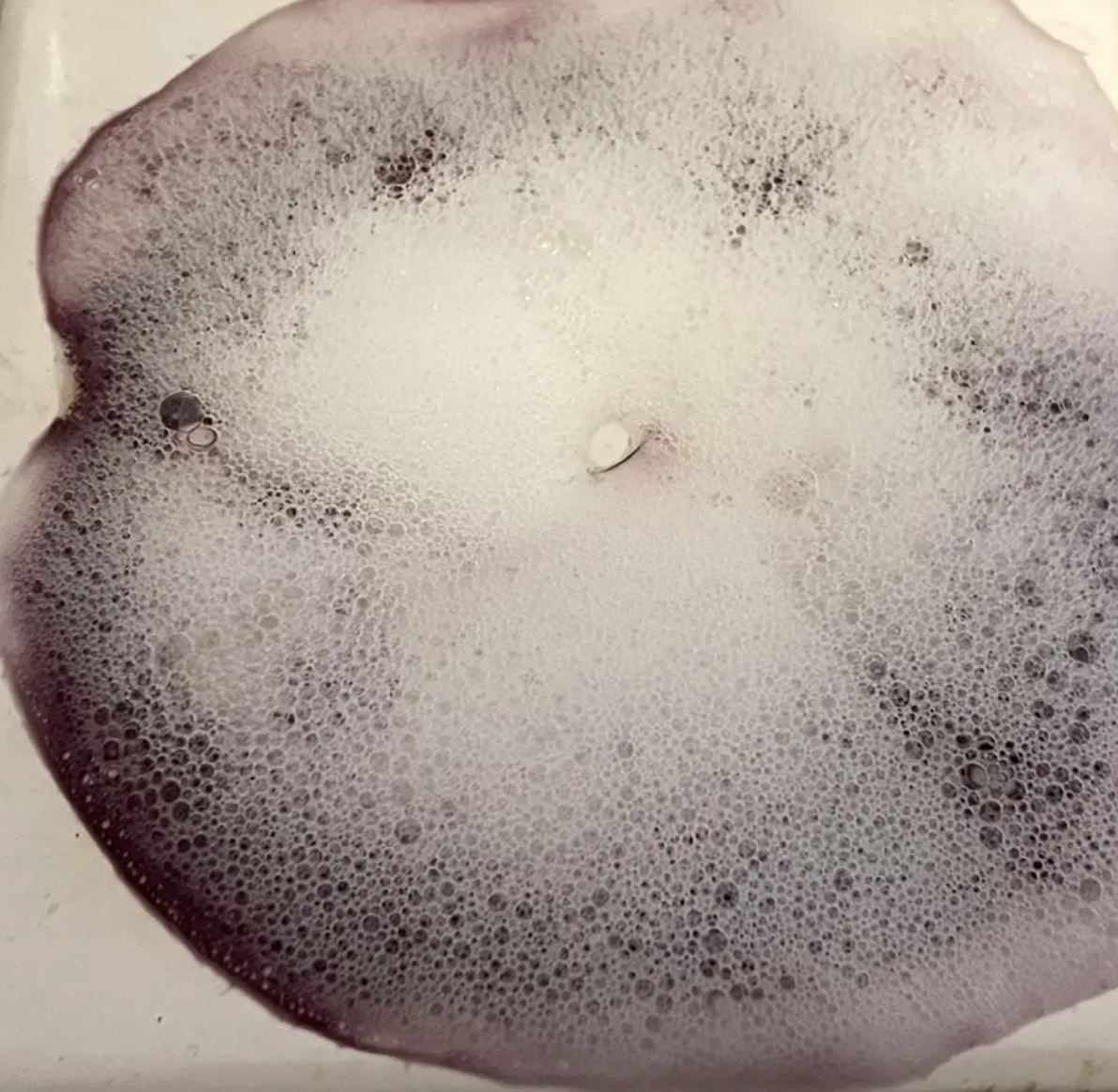 もっちりした泡がサビ汚れ全体を包み込んでくれます。この洗浄成分がサビに反応すると、液剤が紫色に反応します。この“落ちてる感”も楽しい。