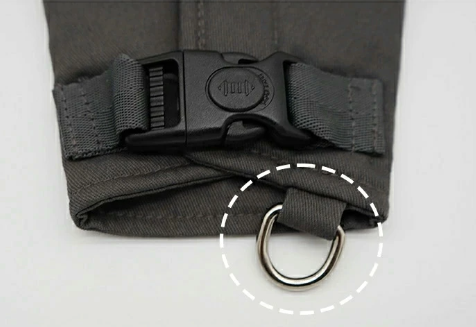 本体の下部にはDリングが設けられ、ここにおもちゃを取り付ければ子供の気をそらすことも可能。細部までこだわり抜かれています。