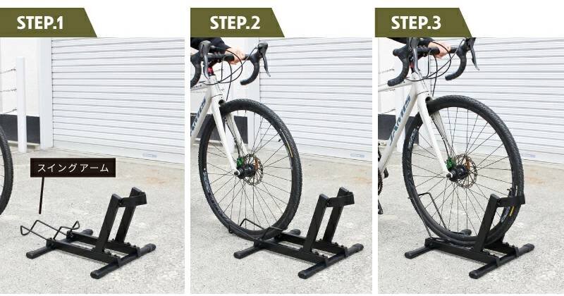 ロードバイクからファットバイク(タイヤ幅最大4.0インチ)まで、幅広い車種に対応。最大73×43.6×最大32.5cmと扱いやすいサイズなので、ガレージや玄関など屋内・屋外のあらゆる場所に設置可能。優れた防錆性能がある粉体塗装によって、長く清潔な状態で使えるところもうれしい。
