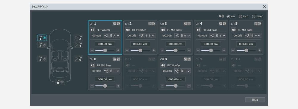 車内に設置すると、それぞれの車両の音響特性に合わせたサウンドチューニングデータが自動提供。設置直後から最適な音質がすぐに楽しめます。さらにタイムアライメントやイコライザー、スピーカー出力レベルなど、お好みでプロセッサーならではの細かい調整も行えます。
