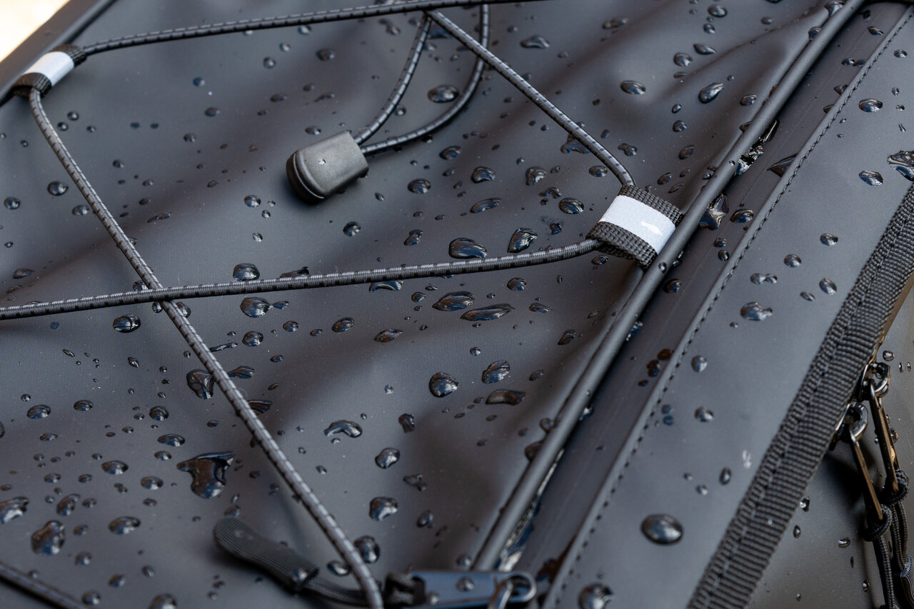 素材にはPVCが採用され、撥水効果を発揮。加えてジッパーには防水加工が施されているほか、レインカバーも付属しているので急に雨が降っても問題ありません。