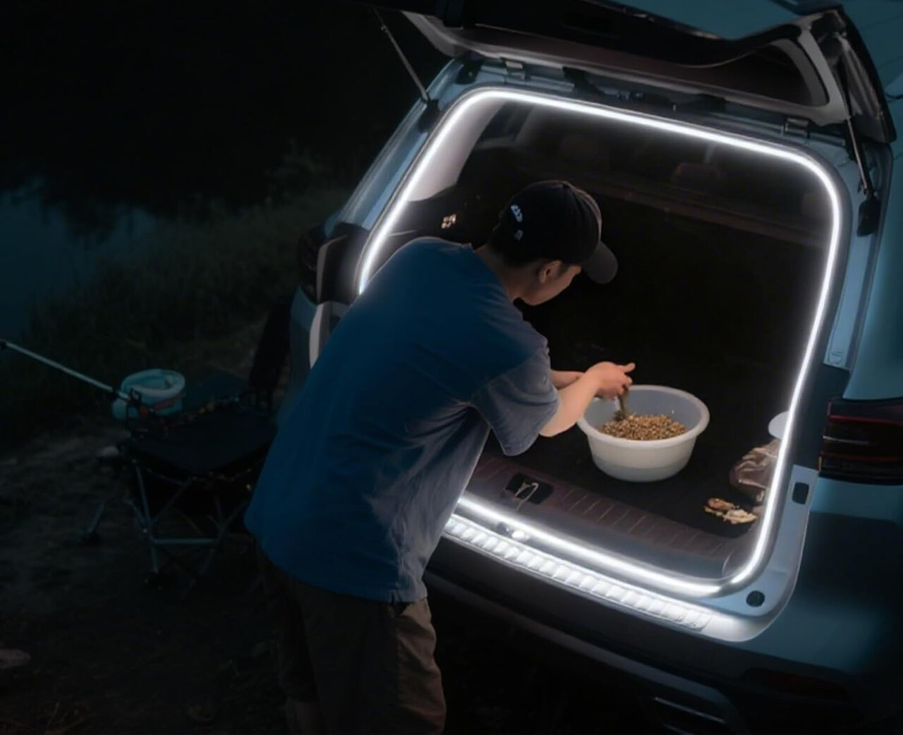 キャンプの夜、車両まわりを光で演出してみない? 流れるような光を放つトランクライトは、簡単に装着できるのに愛車にぴったりフィットするぞ。